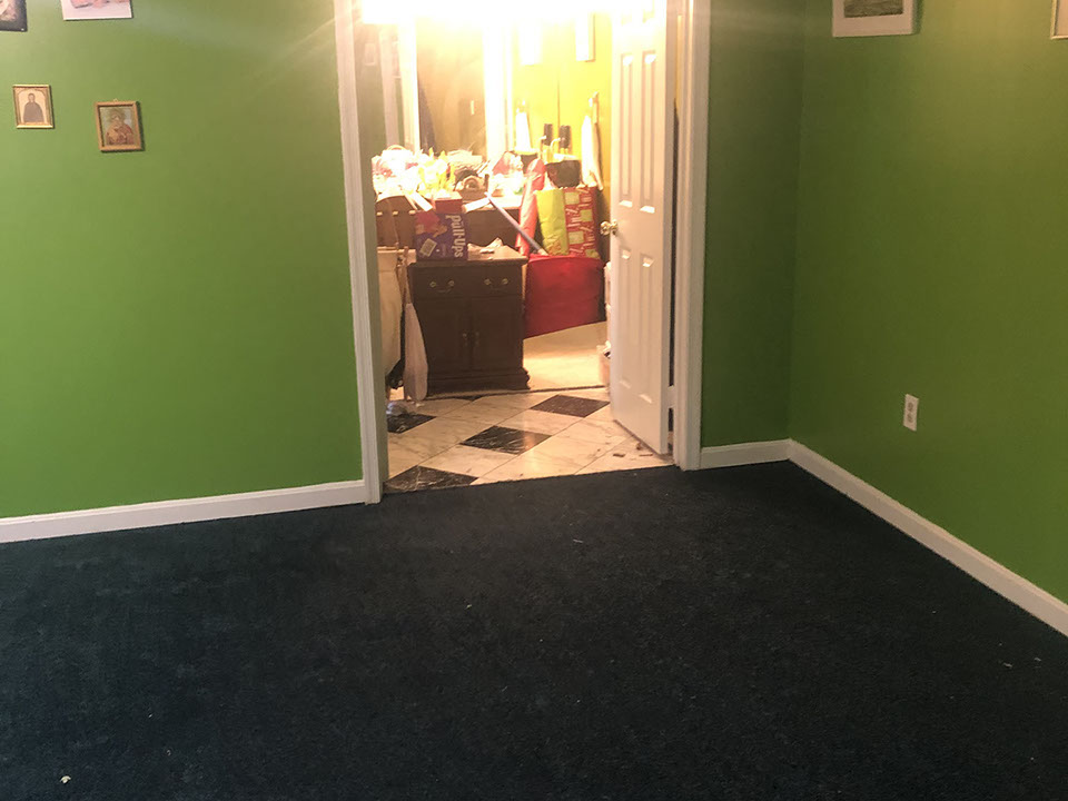 Rich green color carpet Installation in progress. with life time stain resistance warranty.