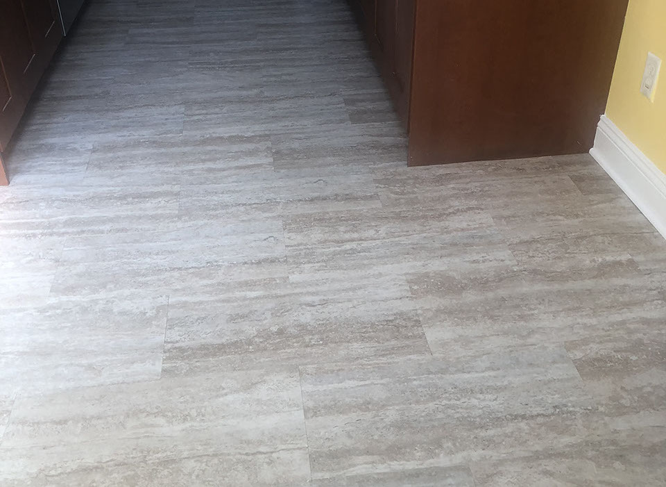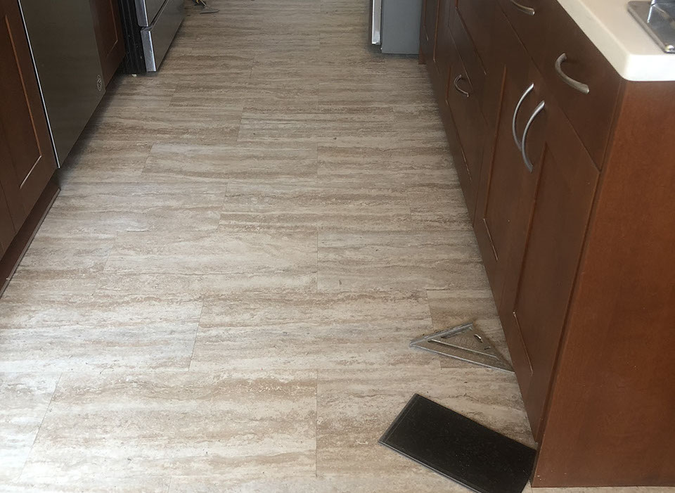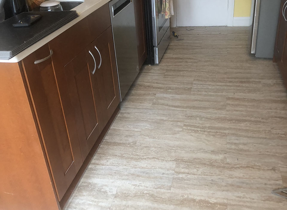 Kitchen with lifetime water damage warranty LVT over under layment